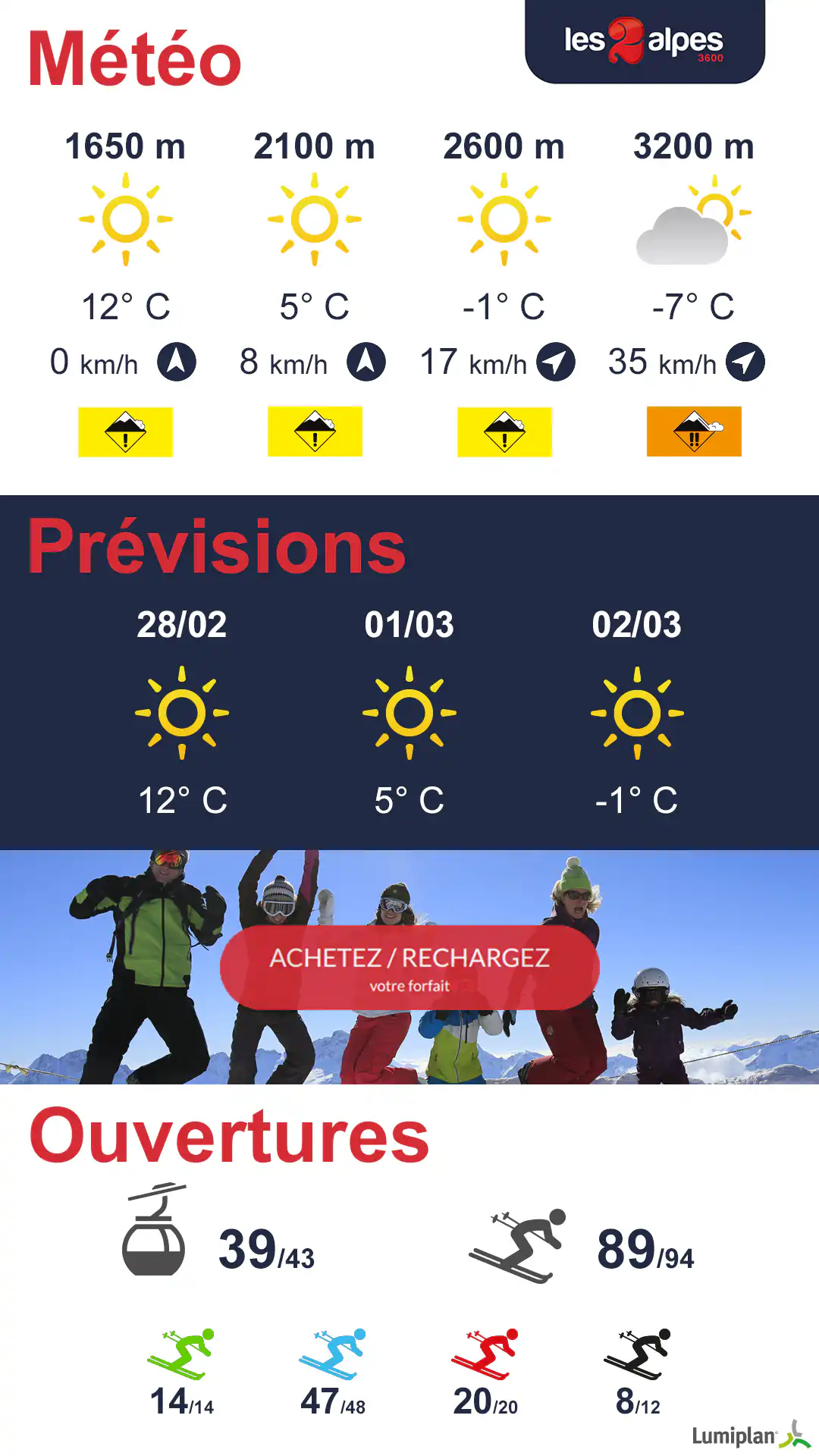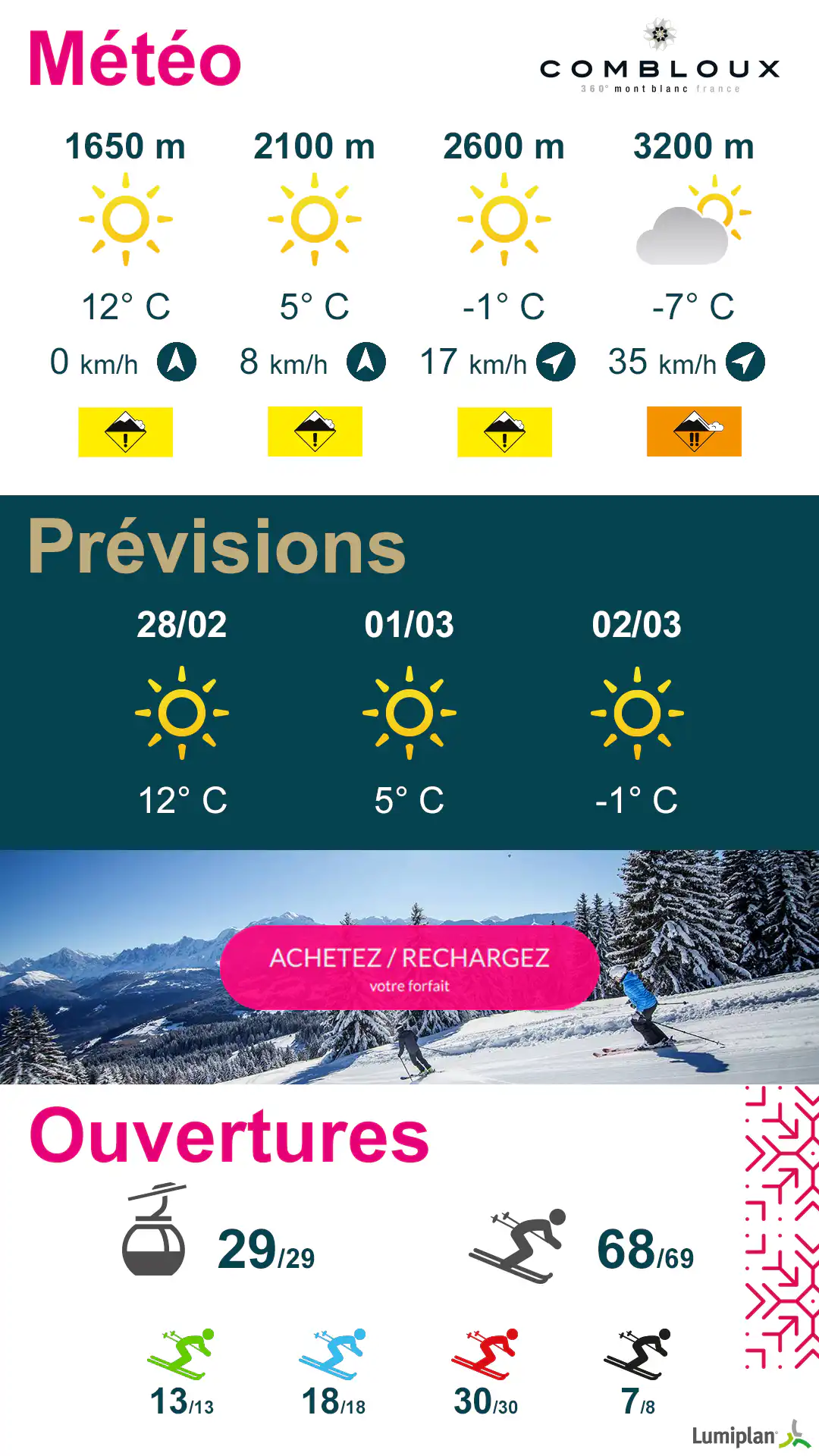 Nous proposons d’ailleurs une offre clé en main avec notre partenaire Lumiplan pour générer les principales informations skieur : météo suivant les altitudes, risques d’avalanche, prévisions à 3 jours, état d’ouverture des pistes et des remontées mécaniques.