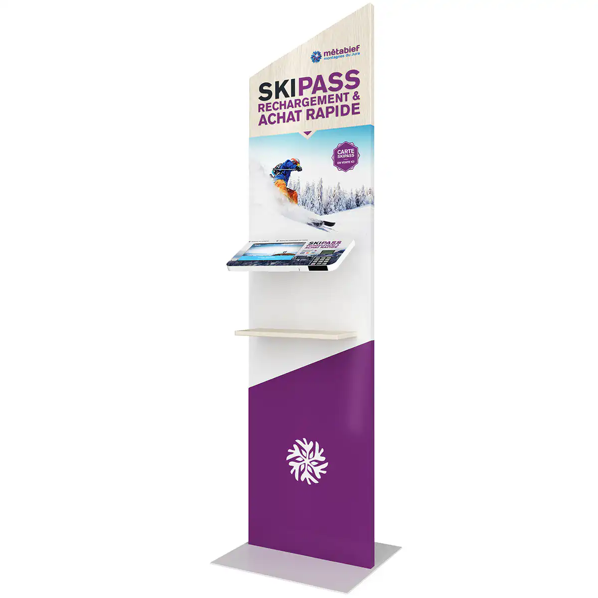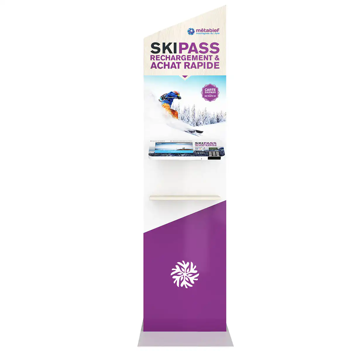 En proposant ce type de point de vente dynamique, vous profitez d’un espace d’affichage d’informations en temps réel et en continu. Le point de vente étant indépendant, vous pouvez le placer au plus près des lieux de vies des skieurs et ainsi désengorger les caisses et points de vente habituels de la station.