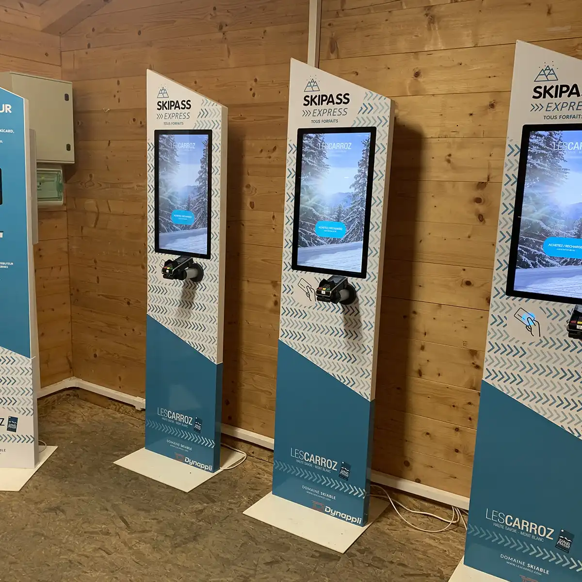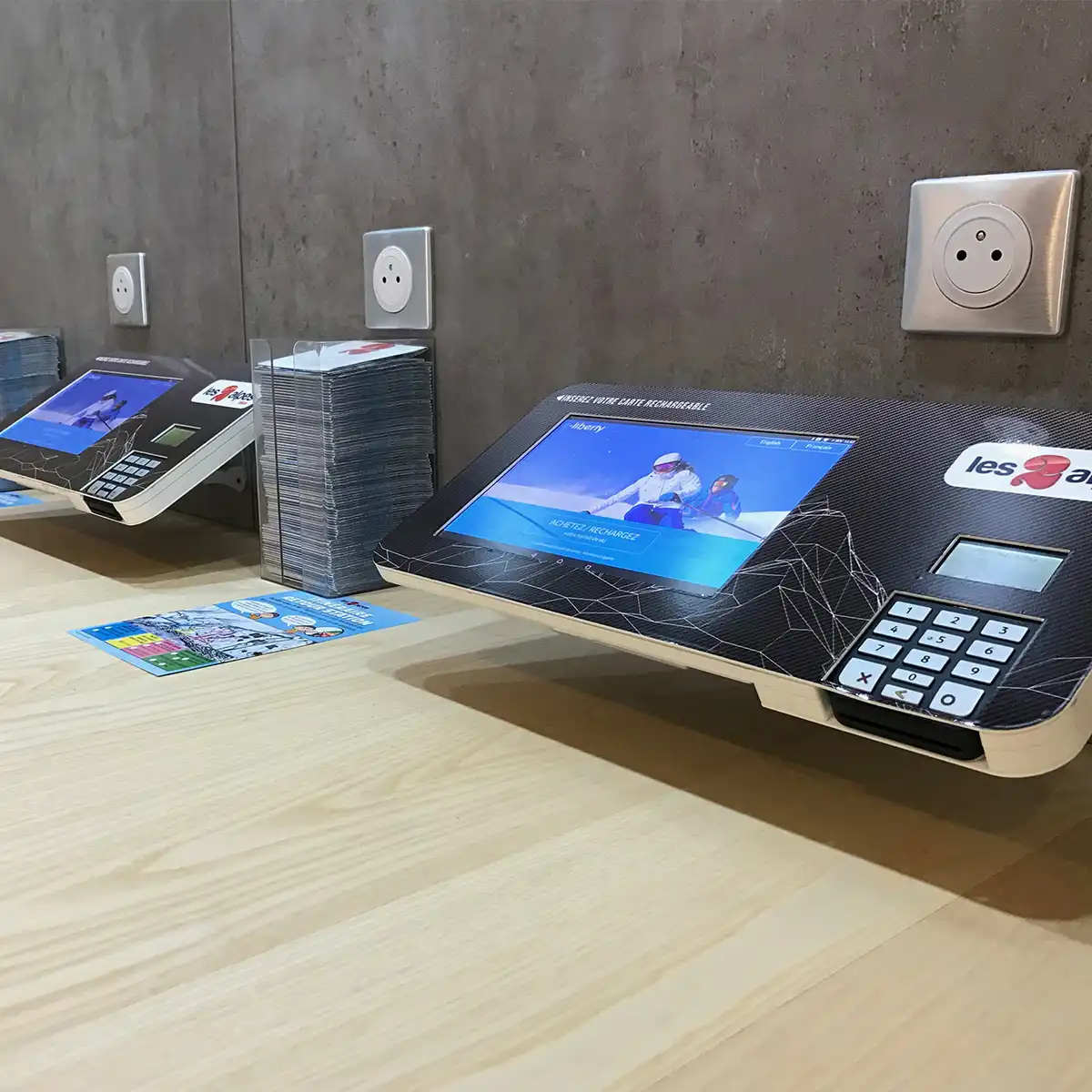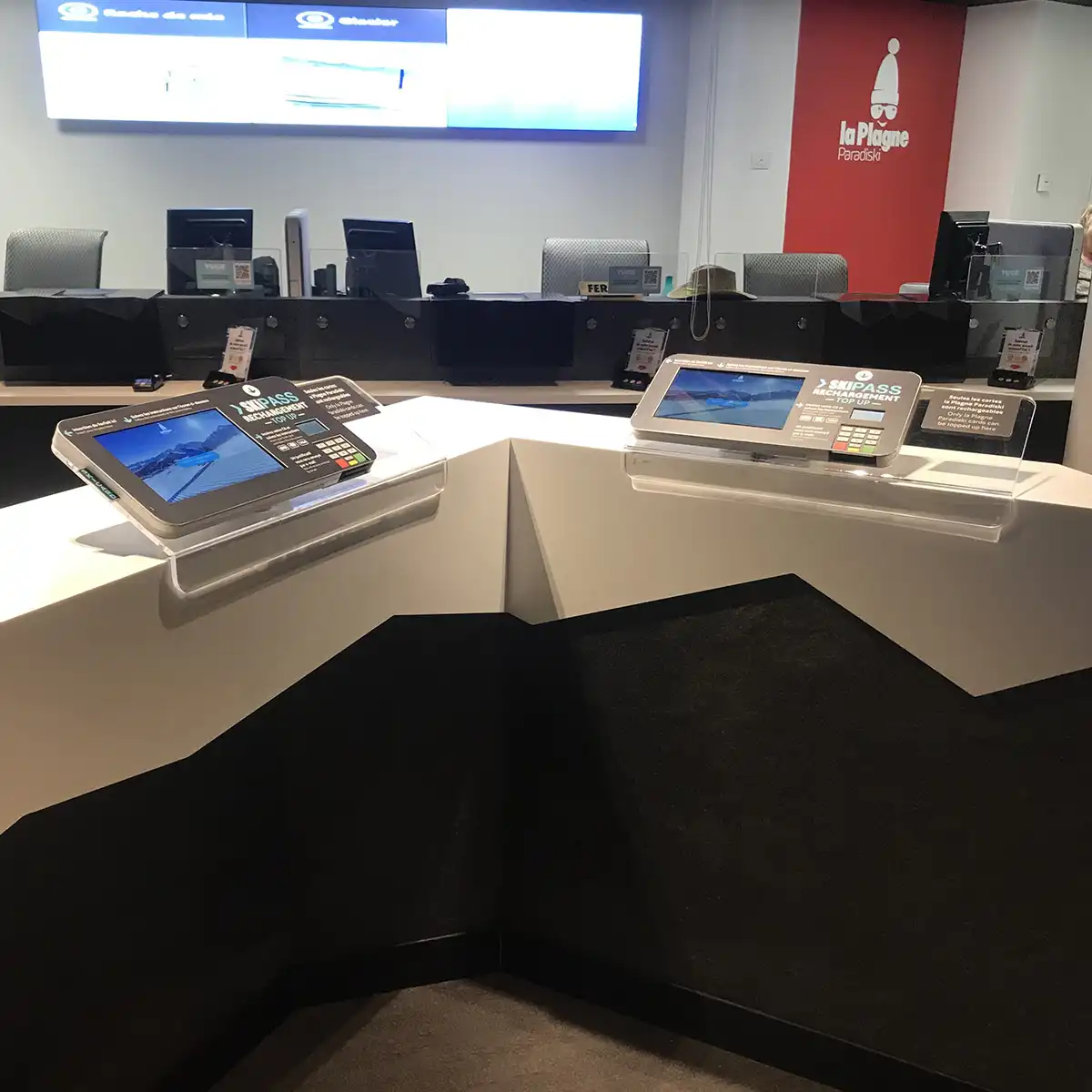 Conscient de l’importance de la présentation et de la visibilité des bornes pour les stations, Dynappli propose également une offre complète d’aménagement de point de vente pour le rechargement de forfaits ski. Création d’un espace digital avec différents écrans de commande ou encore intégration d’écrans muraux dans un espace de vente dédié, découvrez nos solutions :