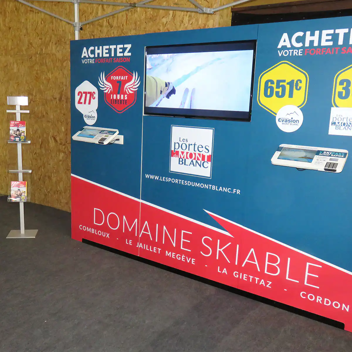 Afin de compléter l’offre, le stand peut être équipé d’un écran d’affichage dynamique de 43’’ pour faire la promotion de la station, pour assurer l’affichage des résultats sportifs ou pour toute autre information utile à la manifestation.