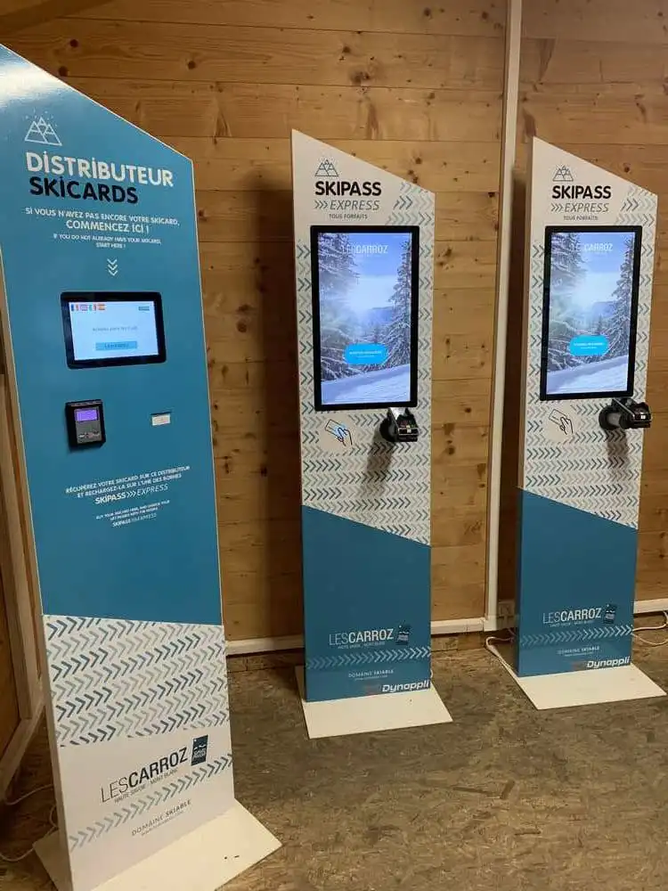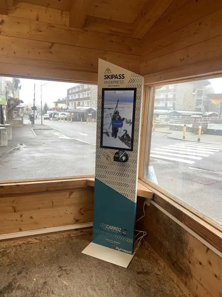 Afin d’apporter une autonomie complète à ce nouveau point de vente digital, nous avons mis en place un tout nouvel automate de distribution de ski card. Equipé d’un terminal de paiement autonome (TPA) sans contact et d’une interface tactile, cette nouvelle borne permettra de fournir une ski card prête à recharger.